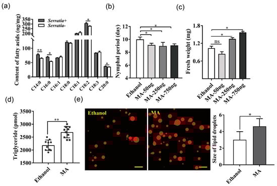 Effects of exogenous fatty acid application on Serratia-free aphids. (a) GC-MS was performed to analyze free fatty acid contents in Serratia-infected and Serratia-free aphids, respectively. Only the top 8 were shown because they represented more than 95% contents of measured fatty acids. C14:0 myristic acid (MA); C16:0 palmitic acid (PA); C16:1 palmitoleic acid (PMA); C18:0 stearic acid (SA); C18:1 oleic acid (OA); C18:2 linoleic acid (LA); C18:3 linolenic acid (α-LA); C20:0 arachidonic acid (AA). (b,c) Nymphal period and body weight of pea aphids treated with different amounts of MA. (d) The triglyceride content in Serratia-free aphids injected with 250 ng MA. (e) Lipid droplets in fat body of Serratia-free aphids fed with 250 ng MA using Nile red staining. Scale bar = 50 μm. Values in plot bars are means ± SE. Data were compared with controls using the Student’s t test: * p < 0.05; ** p < 0.01; while ns indicated no significant difference.