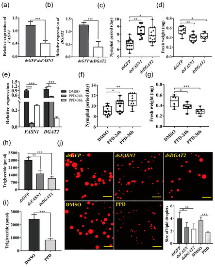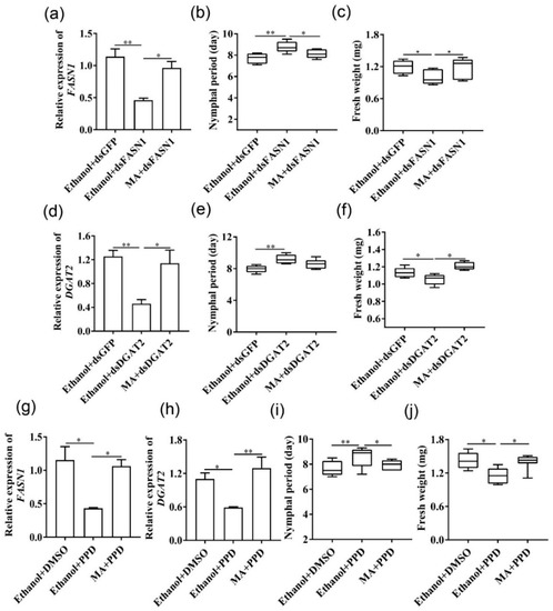 dsFASN1 treatment knocked down FASN1 expression in aphids by 59.6%, increased the nymphal duration, and reduced body weight. Myristic acid (C14:0) injection to aphids that were fed with dsFASN1, however, mostly restored the FASN1 transcript level, normal nymphal duration, and body weight (Figure 5a–c). The same is true for DGAT2-silenced aphids (Figure 5d–f). As expected, supplementation of myristic acid significantly also resumed expression of FASN1 and DGAT2 in PPD-treated aphids, shortened the nymphal duration, and led to body weight gains (Figure 5g–j). These results indicated that exogenous supplementation of myristic acid could rescue aphids from reduced fitness.