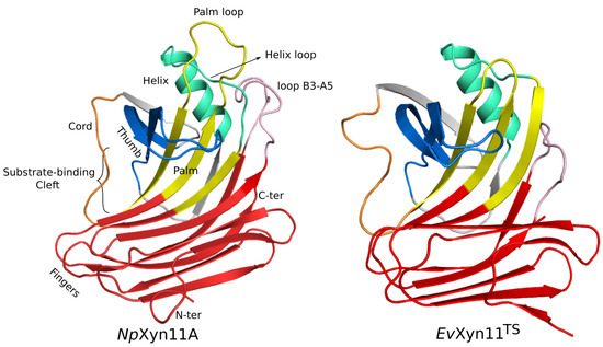 3D structures of NpXyn11A (left) and EvXyn11TS (right). Visual representation of the right-hand analogy regions are indicated: the fingers are in red, palm region is in yellow, thumb region is in blue, cord is in orange, helical region is in cyan-green, and the loop B3-A5 is in pink. The substrate binding cleft is also shown.