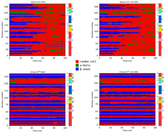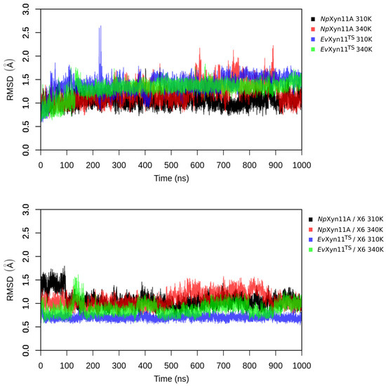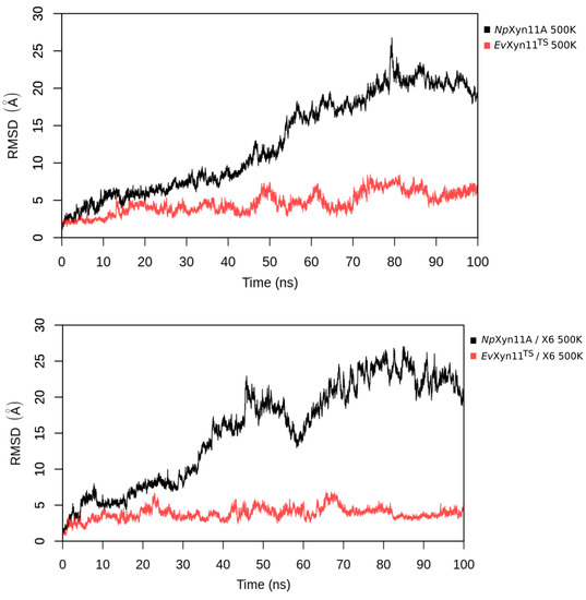 MD simulations were carried out to compare and investigate the mesostable NpXyn11A and the hyper-thermostable EvXyn11TS in their free and X6-bound forms. The stability of the studied systems at different temperatures was evaluated by monitoring the backbone root mean square deviation (RMSD) as a function of time. This was firstly done for short (100 ns) simulations performed at a very high temperature (500 K) in order to compare the resistance of these two enzymes to thermal denaturation and reveal details of the unfolding process (see Figure 2). The corresponding RMSD time series show a drastic increase in the RMSD of NpXyn11A in the free-enzyme and the enzyme–substrate complex (up to 25 Å. Instead, EvXyn11TS presents relatively low RMSDs at such high temperature, especially in the enzyme–substrate complex form.