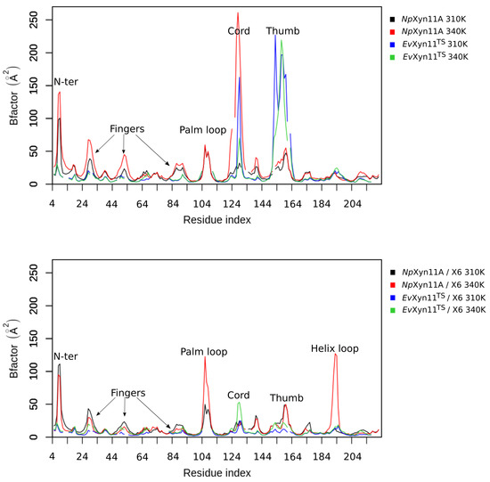 The same backbone B-factor patterns can be observed in both forms of NpXyn11A at 310 K and 340 K, with an expected increase in fluctuations with higher temperature. Overall, EvXyn11TS exhibits lower backbone B-factor values with smaller fluctuations than NpXyn11A. The B-factor profiles of EvXyn11TS in the free enzyme and the enzyme–substrate complex are very similar at 310 K and 340 K, except for the thumb region.