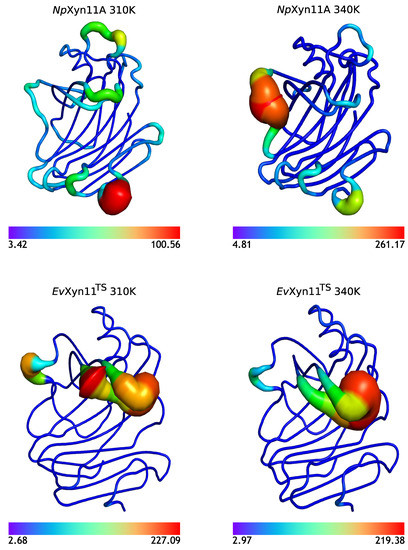 Average backbone B-factor profiles calculated from MD trajectories of NpXyn11A and EvXyn11TS at two different temperatures (310 K and 340 K), mapped onto their backbone. Note that each image uses a specific scale.