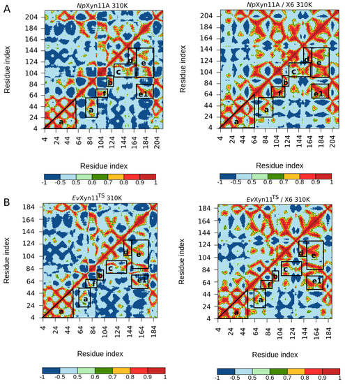 Overall, the flexibility analysis of the mesostable NpXyn11A and hyper-thermostable EvXyn11TS show that EvXyn11TS has less flexible regions and is therefore globally less flexible than NpXyn11A. High B-factor values only appear in the thumb region and only in the free-enzyme form (Figure 6). The greater stability of this region in the enzyme–substrate complex can be explained by the presence of the substrate and its important interactions with the thumb. In order to confirm the previous results and obtain more insights into the conformational dynamic of these flexible regions in both enzymes, we compared the dynamic cross correlation of the backbone of their respective 3D structures, in the presence and in the absence of the substrate.