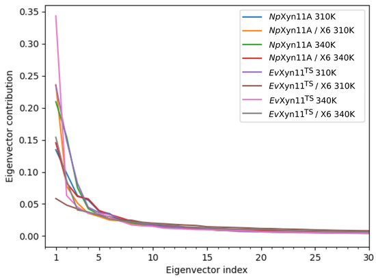 PCA analysis was based on the first two principal components that explain, on average, 30% of the total protein motions. The contribution of the first principal component varies between 5% and 35%. The minimal value of 5% corresponds to the simulation performed on EvXyn11TS in complex with xylohexaose at 310 K. This system showed very low B-factor values in the simulations resulting from the noise that spreads equally along all axis.