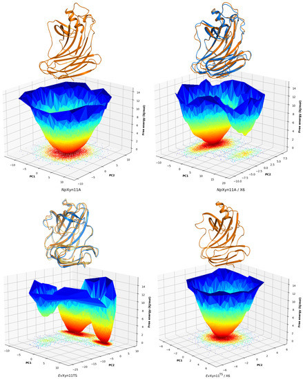 Free-energy landscapes of NpXyn11A and EvXyn11TS at 310 K in their free-enzyme and enzyme–substrate complex forms as a function of the first (PC1) and second (PC2) eigenvectors. The color bar represents the free-energy values in kJ/mol. The 3D structure corresponding to the global free-energy minimum is displayed in orange cartoon, while the blue one refers to the alternative conformation corresponding to the free-energy minimum of the second basin.