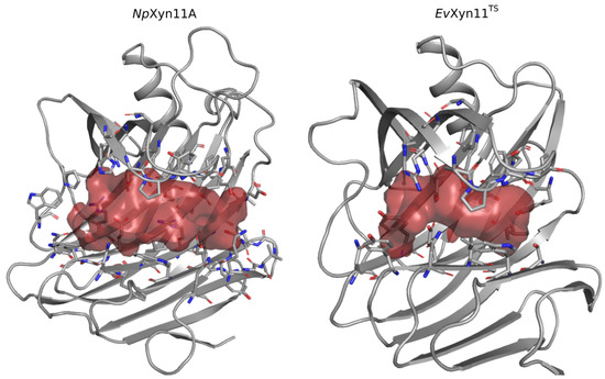 The active site cleft (AS) is almost six times larger in NpXyn11A than in EvXyn11TS. It encompasses 41 residues with a volume of 461.24 Å3 and an area of 521.62 Å2, while the active site cleft of EvXyn11TS possesses only 23 residues, a volume of 77.12 Å3, and an area of 173.27 Å2. The larger and extended binding cleft of NpXyn11A was shown to play an important role in the unusually high activity displayed by this enzyme [17]. Indeed, these active site features may facilitate the access or release of the substrate or product while better accommodating xylose units in each of its subsites. Furthermore, the wider cleft of NpXyn11A might also facilitate the recognition and interaction with decorated xylans and, consequently, their hydrolysis.