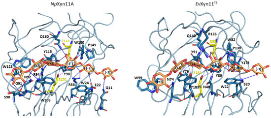 Noncovalent enzyme/xylohexaose contacts found with the Plip web-server on the equilibrated structure structures of NpXyn11A and EvXyn11TS. Amino acid residues (colored in blue) in interaction with the xylohexaose (colored in orange) are shown in sticks. Catalytic amino acid residues are colored in yellow. Hydrogen bonds are shown with blue lines.