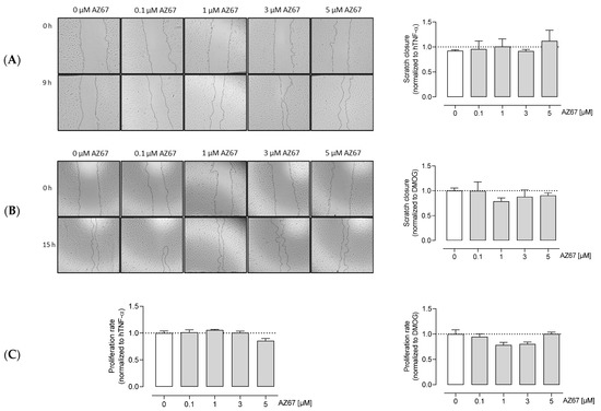 AZ67 does not inhibit the migration and proliferation of HAOEC. Cells were pre-treated with 20 ng/mL TNF-alpha (A), or 1 mM DMOG (B) for 24 h. Each well was marked below the plate surface by drawing a vertical line. A scratch intercepting the marked line was done in each well, cells were rinsed and medium containing different concentrations of AZ67 (0.1, 1, 3, 5 µM) together with 20 ng/mL hTNF-α, or 1 mM DMOG was added. The wound area was measured at 0 and 9 h (for TNF-α treated), and 15 h (for DMOG treated) and migration was quantified. N = 3, p > 0.05 (one-way ANOVA). (C) HAOEC were stimulated with 20 ng/mL hTNF-α (left), or 1 mM DMOG (right) and treated with AZ67 at different concentrations (0.1, 1, 3, 5 µM). After 24 h of incubation time, WST-1 reagent was added to all wells and incubated for an additional 4 h. WST-1 cleavage product was measured using a microplate reader. N = 4, p > 0.05 (one-way ANOVA).