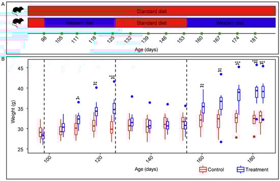 All mice were weighed weekly to monitor bodyweight differences in response to the alternating diet regimen (Figure 1). Overall, the weight of the treatment mice (n = 12) exposed to two WD dietary regimens and one SD regimen was significantly different from that of the control group (n = 12) across 15 timepoints taken at weekly intervals (q = 4.63 × 10−8, N = 360; Kruskal–Wallis test; Figure 1B). The linear comparison showed that at the end of each WD regimen (day 27 and 83), the treatment mice weighed significantly more than SD-fed mice (q-values < 0.001; Wilcoxon rank sum test). Interestingly, the feeding of SD to treatment mice between the two WD periods led to weight loss in the treatment group animals, thus that their bodyweight at the end of the SD period was indistinguishable to that of the animals in the control group. The control mice also gradually gained weight over 84 days.
