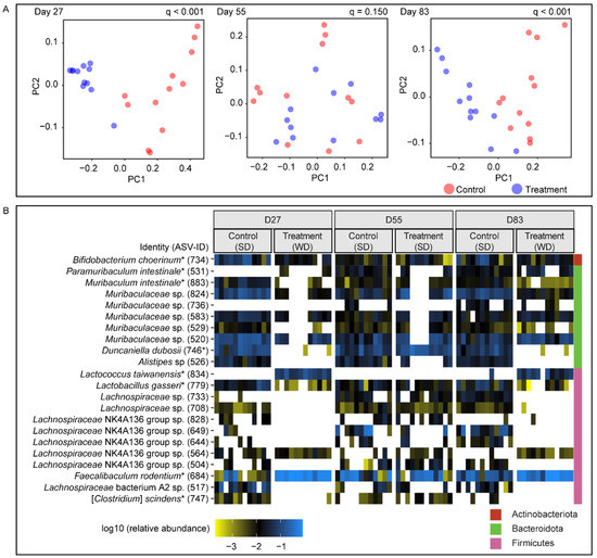 Figure 2. Beta-diversity between fecal microbiota of treatment (n = 12) and control (n = 12) groups. (A) Principal coordinate analysis (PCoA) plots for day-27, -55, and -83 based on the weighted-UniFrac distance. Statistical significance (q-values < 0.05) for PERMANOVA tests comparing weighted-UniFrac distance are shown. (B) A heatmap of 22 ASVs ≥ 0.5 relative abundance (5,203 counts per sample) per day in treatment and control. The absence of ASV is shown as white. ASVs in bold have >99% 16S rRNA gene similarity to the top BLASTn hit.