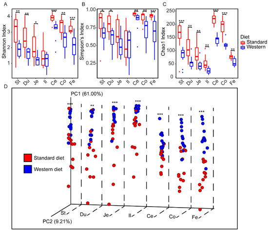 Figure 3. Alpha- and beta-diversity analyses of the gut segment and fecal microbiota in the western diet and standard diet-fed mice. Boxplots depict alpha-diversity shown as (A) Shannon, (B) Simpson’s, and (C) Chao1 indices (Table S2B,C for Wilcoxon rank sum test). (D) A principal coordinate analysis (PCoA) plot showing the weighted-UniFrac distance of grouped segments and fecal samples. Asterisks represent significant difference where (*) denotes q < 0.05, (**) denotes q < 0.01 and (***) denotes q < 0.001; PERMANOVA. St: stomach; Du: duodenum; Je: jejunum; Il: ileum; Ce: cecum; Co: colon; Fe: fecal.