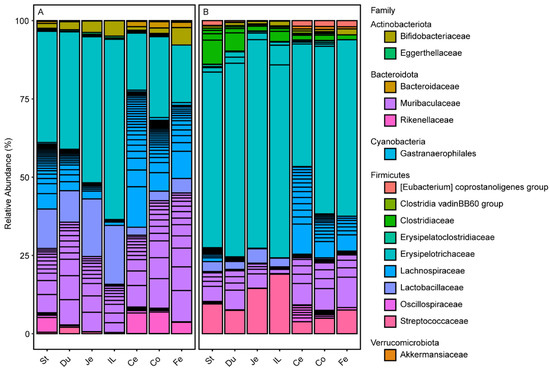 Figure 4. Gut microbiota classified at the family level. (A) Standard diet fed mice. (B) Western diet fed mice. Black horizontal lines on the bar-plots demarcate the different ASVs. Taxa are arranged alphabetically by phylum as indicated in legend headings. St: stomach; Du: duodenum; Je: jejunum; Il: ileum; Ce: cecum; Co: colon; Fe: fecal.