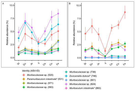 Figure 6. Relative abundance of nine Muribaculaceae ASVs along the gastrointestinal tract and feces. Shown are ASVs with ≥1% relative abundance in at least one segment/fecal group in (A) Control mice. (B) Treatment mice. Asterisks indicate ASVs with identical 16S rRNA genes to type strains. Error bars indicate standard error of the mean (n = 12 except duodenum: control n = 11; ileum: control n = 11, treatment n = 10). St: stomach; Du: duodenum; Je: jejunum; Il: ileum; Ce: cecum; Co: colon; Fe: fecal.