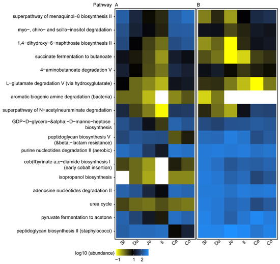 Figure 7. A heat-map representation of differentially abundant predicted pathways between segments of mice gastrointestinal tract of (A) standard or (B) western diet. Differential abundant MetaCyc pathways were identified using analysis of the composition of microbiomes (ANCOM) method. Only statistically significant pathways that fall within a distribution cut-off based on W values are shown (Table S5B for W values). The absence of pathway is shown as white. The mean abundance (rarefied to 132,892 counts per sample) is shown. St: stomach; Du: duodenum; Je: jejunum; Il: ileum; Ce: cecum; Co: colon.