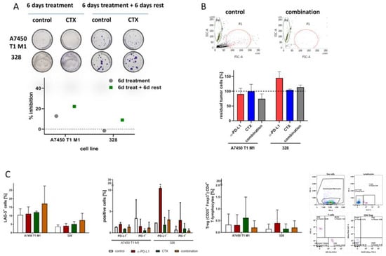 Experiments revealed individual responses, with more evident growth inhibition in A7450 T1 M1 cells than in 328 cells (Figure 1A). For the former, cell density was approximately 20% lower after low-dose CTX treatment and remained decreased even after 6 days of rest. For the 328 cells, a decelerated response profile was observed with a lack of initial growth inhibition, but reduced cell numbers after an additional 6 days of rest, finally reaching an inhibition of 15%. The numbers of viable cell colonies were thus below controls. Then, a semi-autologous short-term co-culture system was used to analyze the impact of the immune system. Tumor and immune cells were co-cultured in the presence of CTX, α-PD-L1, or a combination of both, and residual cells were counted after 72 h via flow cytometry (Figure 1B). Treatment with α-PD-L1 stimulated immune-mediated killing of A7450 T1 M1, but not 328 cells. CTX itself had no influence on tumor cell numbers. The combination of both agents boosted the immune-mediated killing of A7450 T1 M1 cells. Here again, 328 cells were resistant towards killing, and cell numbers even increased (Figure 1B). Then, the immune cells were stained for typical surface antigens to check for activation and exhaustion markers. Numbers of Lag3+ T-lymphocytes increased in the combination (Figure 1C). PD-L1+ and PD-1+ cells were lower in T-lymphocytes exposed to A7450 T1 M1 cells and the combination therapy, while both markers were elevated under α-PD-L1 treatment. No change was seen for the 328-edited lymphocytes, irrespective of the treatment. Likewise, numbers of CD4+CD25+Foxp3+ regulatory T cells were lower in lymphocytes co-cultured with A7450 T1 M1 cells and the combination therapy.