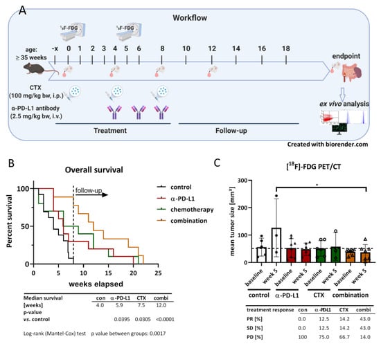 Therapy protocol and Kaplan-Meier survival curve. (A) Schematic therapeutic protocol including PET/CT imaging, blood collection and endpoint procedure. (B) Kaplan-Meier survival curve. Mice were treated with α-PD-L1 (clone 6E11, Genentech, 2.5 mg/kg bw, i.v., q2w), gemcitabine (100 mg/kg bw, i.p., q4wx3, CTX = chemotherapy), or a combination of chemotherapy, followed by α-PD-L1 antibody therapy four weeks later. (C) Tumor progression under therapy, measured with [18F]FDG PET/CT. The mean tumor volume ± SD in mm³ are shown. Measurements were taken at start of the respective therapy and 5 weeks later (n = 3–8 mice/group and time-point). * p < 0.05; one-way ANOVA (Dunnett’s multiple comparison test).