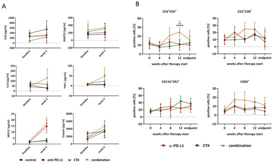 Furthermore, immunological changes in the blood were recorded routinely via flow cytometry (Figure 3). The plasma was analyzed using a multiplex cytokine assay (Figure 3A). IL10 and RANTES concentrations did not change over time in any of the four groups, whereas, in the combination, IL13, TNFα, MIP1β, and EOTAXIN levels increased, which might be due to an increase in cytokine-secreting T cells. Besides, α-PD-L1 monotherapy also increased MIP1β concentration to the same level as the combination treatment. Additional flow cytometric phenotyping of blood samples showed quite similar levels of positive cells in both monotherapy groups, while the combination therapy induced CD3+CD4+ T-helper cells significantly after 12 weeks of treatment (p < 0.01 combination vs. α-PD-L1; p < 0.01 combination vs. CTX, Figure 3B). Moreover, the CD3+CD8+ cytotoxic T cells increased by trend in the combination group as well as CD83+ cells, indicative of activated B-cells and dendritic cells. The numbers of CD11b+GR1+ myeloid-derived suppressor cells (MDSCs) did not differ between individual treatment groups.