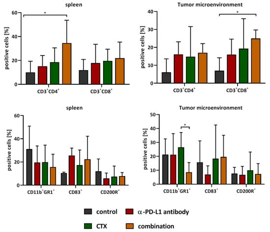 At the endpoint, either determined by humane endpoints or after several weeks of follow-up observation, spleens and residual tumors were analyzed using flow cytometry (Figure 4). Similar to the blood, numbers of CD3+CD4+ T-helper cells significantly increased in the spleen after combinational treatment (p < 0.05 vs. control). CD3+CD8+ cytotoxic T cells and CD83+ cells were slightly increased after all three therapies. In contrast, CD11b+GR1+ MDSCs and CD200R+ cells decreased upon treatment. The therapy effect on tumor infiltrating T cells goes hand in hand with the effect in the spleen. All three groups were characterized by increased T cell levels, reaching significance in the combination (CD3+CD8+ T cells, p < 0.05 vs. control). The percentage of CD11b+GR1+ MDSCs was as high as in the control in the monotherapies but decreased significantly after combination therapy. The numbers of CD83+ cells did not change considerably but declined in the α-PD-L1 monotherapy. No effect was seen for CD200R+ cells, implicating a minor role in the immune regulatory functions of CD200-CD200R interaction.