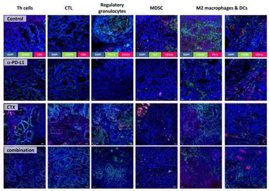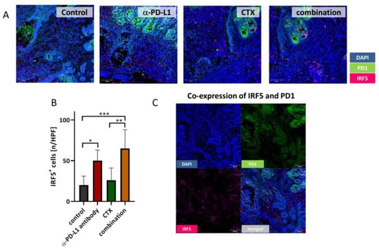 In addition to flow cytometry, the tumor microenvironment was studied in detail by fluorescence microscopy (Figure 5 and Figure 6). The amount of cytotoxic T-lymphocytes was higher upon CTX and the combination treatment. T-helper cells additionally increased by CTX. MDSCs were only visible in the control and CTX groups, and thus effectively eliminated by the α-PD-L1 antibody. M2 macrophages and DCs were present in all groups, but their density and location differed between groups (Figure 5). PD-1 expressing M2 macrophages vanished in the combination, in a similar manner to regulatory granulocytes, which were more abundant in the control and CTX groups. Hence, the α-PD-L1 antibody itself shaped the tumor microenvironment by eradicating immunosuppressive cell populations (i.e., CD11b+PD-L1+, CD206+PD1+) and promoting infiltration of antigen-presenting cells (CD11c+). In support of this, we also found significantly higher levels of IRF5+ cells within tumor sections treated with the α-PD-L1 antibody alone or in combination with CTX (Figure 6A,B). In most cases, IRF5+ cells co-localized with PD1+ cells in the lymphoid compartment within the tumors (Figure 6C). Hence, IRF5 may constitute a direct indicator for successful immune activation in α-PD-L1-based regimens.