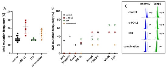 The therapies not only induced immunological changes but also influenced the mutational frequency in Mlh1−/− tumors (Figure 7). Both α-PD-L1 mono- and combinational therapy increased the overall mutation frequency of the tumor (Figure 7A). Figure 7B shows the mutation frequencies in dMMR-target genes. Frameshift mutations in APC, Tmem60, and Casc3 were no longer detectable upon treatment, likely because of eradicating single mutated cell clones. By contrast, novel mutations appeared (Figure 7B,C). Mutation frequencies in cMS repeats of MDC1 slightly increased after α-PD-L1 monotherapy and CTX. Additionally, cMS mutation frequencies in Senp6, Mbd6, and Lig4 increased after α-PD-L1 monotherapy. Since this trend was not seen in the combination, specific elimination is likely. Lig4 is the only exception. Here, cMS mutations were only detectable upon treatment but remained comparably low in the combination. CTX monotherapy alone triggered mutations in cMS of MDC1, Mbd6, and Lig4.