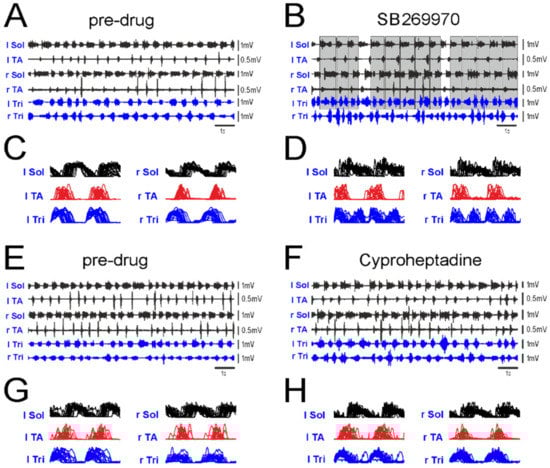 - Liu, J.; Akay, T.; Hedlund, P.B.; Pearson, K.G.; Jordan, L.M. Spinal 5-HT7 receptors are critical for alternating activity during locomotion: In vitro neonatal and in vivo adult studies using 5-HT7 receptor knockout mice. J. Neurophysiol. 2009, 102, 337–348. [Google Scholar] [CrossRef]