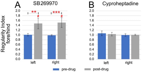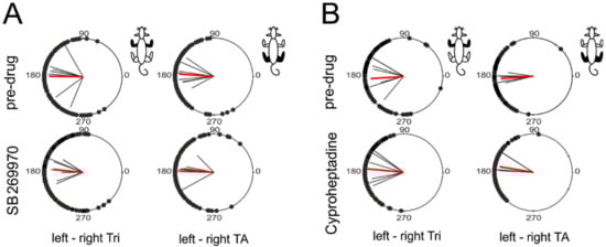 First, we investigated the correctness of the locomotor pattern in fore- and hindlimb using the circular analysis to establish left-right interlimb coordination in both girdles separately during quadrupedal locomotion on the treadmill, which recovered in the time of ELRP after SB269970 (8 rats) and after cyproheptadine (six rats out of eight tested with SB269970). Our analysis (Figure 2A,B) demonstrated the presence of a very consistent alternate pattern in both girdles close to 180° phase shift between onsets of EMG bursts of left-right homologous muscles (Tri muscles in the forelimbs and TA muscles in the hindlimbs) that was associated with high strength of interlimb coordination (expressed as r-value > 0.75; p < 0.001, Rayleigh’s circular statistical tests). The circular analysis demonstrated clear interlimb left-right coordination in fore- as well as hindlimb movements, which was at a similar level both before and after either drug application (Figure 2A; Table 1).