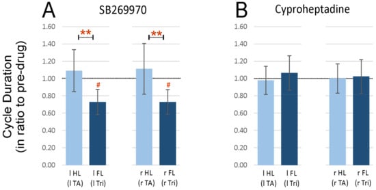 Cycle duration established in forelimbs (based on the Tri EMG activity) and hindlimbs (based on the TA EMG activity) in ratio to that from the pre-drug condition during spontaneous locomotion on a treadmill in intact rats after blockade of 5-HT7 (A) or 5-HT2A (B) receptors by intrathecal application of SB269970 or cyproheptadine (respectively) at lumbar spinal cord segments. Statistical significance for comparison between fore vs. hind limb cycles: ** p < 0.005; Statistical significance for difference from 1. # p < 0.05. Abbreviations: TA, tibialis anterior muscle; Tri, triceps brachii muscle; l, left; r, right; FL, forelimb; HL, hindlimb.