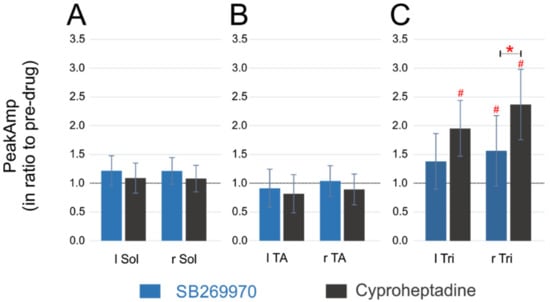 The peak amplitude of the EMG burst activity in ratio to the pre-drug condition established in the Tri muscle (C) of both forelimbs and the Sol (A) and TA (B) muscles of both hindlimbs during spontaneous locomotion on a treadmill in adult rats after blockade of 5-HT7 or 5-HT2A receptors by intrathecal application of SB269970 or cyproheptadine (respectively) at lumbar spinal cord segments. Statistical significance for comparison of effects of both drugs: * p < 0.05; Statistical significance for difference from 1: # p < 0.05.