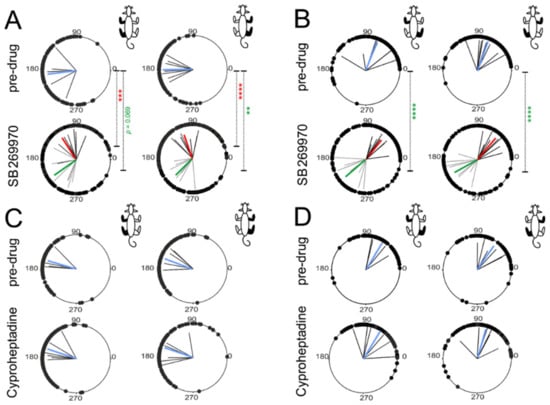 Next, to determine whether the coordination between ipsilateral and diagonal pairs of limbs during a locomotor performance on the treadmill at the time of ELRP is affected by blockade of 5-HT7 or 5-HT2A receptors, the circular analysis was performed. To investigate the coordination of the pair of ipsilateral limbs (i.e., the phase shift as well as the coordination strength), the onsets of the EMG burst activity recorded from the Tri muscle in the forelimbs versus the hindlimb cycle based on the Sol muscle EMG burst activity was analyzed. Circular analysis of the interlimb coordination between ipsilateral fore- and hindlimb extensor muscles (Tri vs. Sol) demonstrated that the limbs moved approximately in the opposite phase in both pre-drug conditions (Figure 6A,C; Table 2 and Table 3) and this did not change after cyproheptadine (Figure 6C; Table 3).