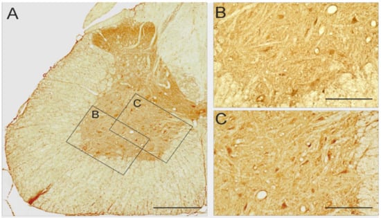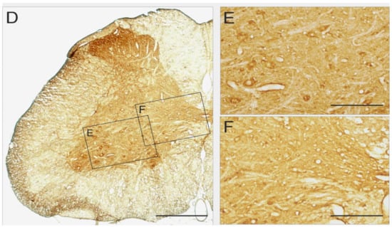 - Reed, W.R.; Shum-Siu, A.; Whelan, A.; Onifer, S.M.; Magnuson, D.S. Anterograde labeling of ventrolateral funiculus pathways with spinal enlargement connections in the adult rat spinal cord. Brain Res. Bull. 2009, 1302, 76–84. [Google Scholar] [CrossRef]
