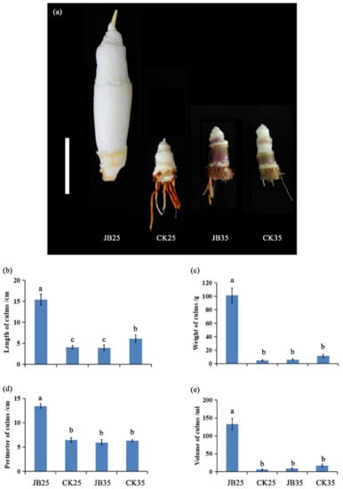 The other plants, including Z. latifolia plants without U. esculenta infection (CK) grown at 25 °C (CK25), as well as CK and JB plants grown at 35 °C (CK35, JB35), did not produce swollen culm gall, and exhibited a significant decrease in length, weight, perimeter, and volume in culms compared to JB25 (p < 0.05). These results clearly demonstrate that culm gall can form in JB plants grown at 25 °C, while gall induction was completely suppressed by a temperature of 35 °C.