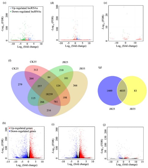 RNA-sequencing was performed on culms of JB and CK plants grown at 25 °C and 35 °C. Our analysis indicated that 3194 and 173 lncRNAs were identified in Z. latifolia and U. esculenta, respectively. Among those lncRNAs identified in Z. latifolia, 144 were uniquely expressed in JB25 (Figure 2a). Meanwhile, among the lncRNAs identified in U. esculenta, 106 were uniquely expressed in JB25 (Figure 2b). Further analysis showed that 293 differentially expressed (DE) lncRNAs were identified in Z. latifolia between JB35 and JB25 (90 upregulated in JB25) (Figure 2c), and 149 between CK35 and CK25 (134 upregulated in CK25), respectively (Figure 2d). In U. esculenta, only ten DE lncRNAs were identified between JB25 and JB35, five of which were upregulated in JB25 (Figure 2e).