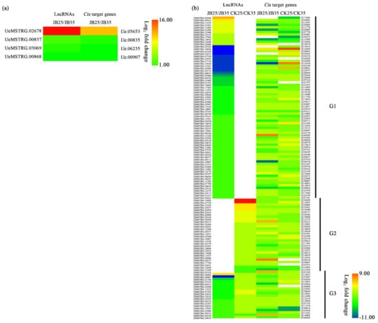 Further, the 126 DE lncRNAs in Z. latifolia and their potential cis-target genes were divided into three groups (G1–G3) according to their expression patterns under different temperatures (Figure 3b). In group G1, there were 76 lncRNAs differentially expressed between JB25 and JB35, indicating that these lncRNAs, and their potential cis-target genes, may be involved in temperature-dependent gall formation. Meanwhile, in group G2, 31 DE lncRNAs were found between CK25 and CK35, implying that they, along with their potential cis-target genes, are not associated with temperature-dependent gall formation. In addition, in group G3, 19 DE lncRNAs were identified between both JB25/JB35 and CK25/CK35, suggesting that some of these lncRNAs and their potential cis-target genes may be involved in temperature-dependent gall formation.