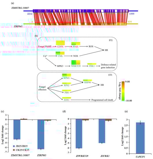 To validate the putative relationship between lncRNA ZlMSTRG.30807 and ZlRPM1, their expression levels were examined by quantitative reverse-transcription PCR (qRT-PCR) (Figure 4c). qRT-PCR results were consistent with the RNA-seq data for expression of lncRNA and mRNA (Figure S2). Additionally, expression levels of the pattern-triggered immunity (PTI) marker genes ZlWRK29 and ZlFRK1, as well as UePEP1, which encodes the effector pep1 in U. esculenta, were also examined by qRT-PCR. Through qRT-PCR analysis, we observed downregulation of ZlWRK29 and ZlFRK1 in JB25 compared to JB35, and slight difference between CK25 and CK35. Moreover, increased expression of UePEP1 was observed in JB25 compared to JB35 (Figure 4d,e).