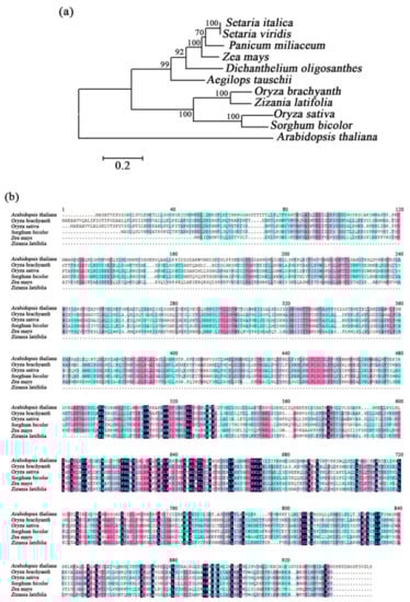 Because the expression pattern of ZlRPM1 in Z. latifolia differed from that in A. thaliana, bioinformatics analysis of ZlRPM1 was further performed. Multiple alignments of protein were performed with DNAMAN 9.0. Amino acid sequences were available from GeneBank (https://www.ncbi.nlm.nih.gov/genbank/). The accession numbers used were as follows: Oryza brachyantha (XP_006664891.2), Oryza sativa (XP_015624344.1), Sorghum bicolor (XP_002453451.2), Aegilops tauschii (XP_020194017.1), Panicum miliaceum (RLM58947.1), Dichanthelium oligosanthes (OEL23414.1), Setaria viridis (XP_034568495.1), Setaria italica (XP_004979036.1), Zea mays (AQK58490.1), Arabidopsis thaliana (AAF27008.1). Phylogenetic tree analysis was performed using the MEGA6.0 program.