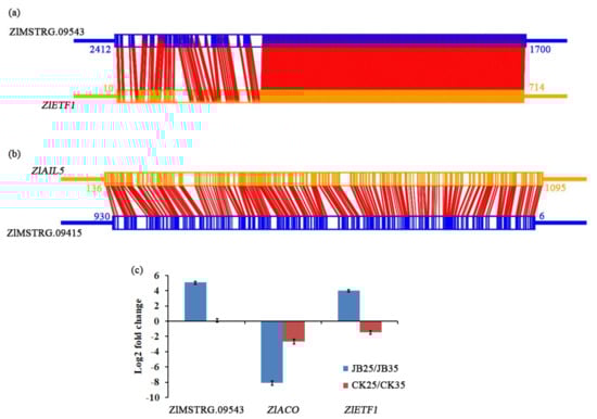 Among the DE lncRNAs in G1 and G3 groups, we found that the cis-target genes of ZlMSTRG.09543, ZlMSTRG.05484, and ZlMSTRG.09415 were related to ethylene (ET) signalling pathway (Table S2). Using the RNAplex tool, we found that lncRNA ZlMSTRG.09543 could interact with the ethylene-responsive transcription factor 1 (ZlETF1) gene (Zl.05881) (Figure 6a). The ZlMSTRG.09543 was upregulated in JB25 compared to JB35, but no significant difference was observed between CK25 and CK35. Further, ZlETF1 showed a slightly increased expression in JB25 compared to JB35, and a lower expression in CK25 compared to CK35. In addition, it was predicted that lncRNA ZlMSTRG.09415 might interact with AP2-like ethylene-responsive transcription factor AIL5 (ZLAIL5) (Zl.25034) (Figure 6b). ZlMSTRG.09415 was downregulated in JB25 compared to JB35. Similarly, ZlAIL5 exhibited lower expression in JB25 than in JB35, while no significant difference between CK25 and CK35 (Table S2). Among six DE genes involved in ET biosynthesis identified in Z. latifolia (Table 2), gene encoding ethylene-forming enzyme 1-aminocyclopropane-1-carboxylate oxidase (ZlACO) (Zl.07467, Zl.09320) was downregulated in JB25 compared to JB35, but only slightly different between CK25 and CK35.