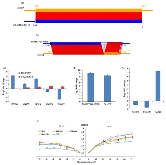 In total, 21,832 plant genes and 5567 fungal genes were identified in CK and JB plants, respectively (Figure 2f,g). In Z. latifolia, 7036 and 6549 DE genes were identified between JB25 and JB35 (Figure 2h) and between CK25 and CK35 (Figure 2i), respectively. Specifically, in U. esculenta, 301 DE genes were identified between JB25 and JB35, including genes encoding effectors and transporters, genes involved in protein synthesis and amino acid metabolism (Figure 2j, Table S1).
