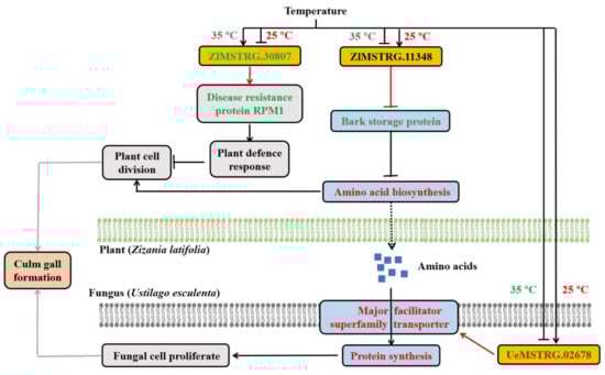Hypothetical model of temperature-dependent culm gall formation. Under lower temperature (25 °C), the ex-pression of lncRNA ZlMSTRG.30807 is suppressed resulting in down-regulation of gene encoding disease resistance pro-tein RPM1 and inhibition of the plant defence response, which induces plant cell division in Zizania latifolia infected with Ustilago esculenta. The expression of lncRNA ZlMSTRG.11348 may be induced in Z. latifolia infected with U. esculenta and it may negatively regulate the expression of the gene encoding bark storage protein, which further induces amino acid biosynthesis under cooler temperatures. These amino acids may not only provide nutrients for plant cell division but also be obtained by U. esculenta through the major facilitator superfamily transporter, which is positively regulated by lncRNA UeMSTRG.02678, and further be used for protein synthesis in fungal cell proliferation. These events induce culm gall formation in Z. latifolia infected by U. esculenta under decreased temperatures. High temperature (35 °C) may inhibit the expression of lncRNA ZlMSTRG.11348 and induce the expression of lncRNA ZlMSTRG.30807 causing inhibition of amino acid metabolism and induced plant defence response in Z. latifolia. The expression of lncRNA UeMSTRG.02678 and its cis-target gene encoding major facilitator superfamily transporter is also suppressed in U. esculenta. These largely inhibits culm gall formation. Red and green indicate increased and decreased expression levels of genes or pathways, wherein most genes are up-regulated and down-regulated, in Z. latifolia infected by U. esculenta grown at 25 °C, respectively. Red arrows indicate the predicted regulation between lncRNAs and their cis-target genes.