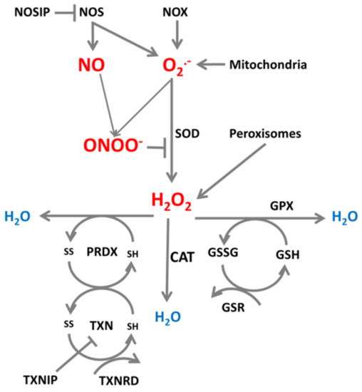 To keep the whole system functioning, oxidized antioxidant molecules must be reduced once again and this is the role of glutathione reductases (GSR) [20] and thioredoxins (TXN) [35]. Thioredoxins are small redox proteins which are reduced depending on NADPH by thioredoxin reductase. They serve as donors of electrons and reduce cysteine groups on proteins. Thioredoxin together with thioredoxin reductase constitutes a very important element of the peroxiredoxin and glutathione peroxidase antioxidant systems [35]. Peroxiredoxins, thioredoxins, and glutathione contain cysteines with thiol groups that exist in the reduced (SH) or oxidized (S-S) form. Peroxiredoxins become oxidized when reducing H2O2, and then are reduced by thioredoxins which become oxidized. To keep the system working, oxidized thioredoxins are reduced by thioredoxin reductases (TXNRD), essential elements of the thioredoxin system, to restore their enzymatic activity [36]. The electrons needed for these reduction reactions originate from reduction reactions permanently ongoing during metabolic reactions [30,36]. Additional regulators of these systems are nitric oxide synthase interacting protein (NOSIP) which interacts with NOS and limits NO production [37], and thioredoxin interacting protein (TXNIP) which modulates the action of the thioredoxin-thioredoxin reductase system and inhibits the antioxidative function of thioredoxin, resulting in accumulation of ROS and cellular stress [35].