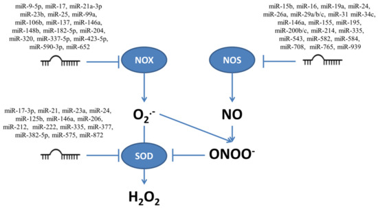 The multiple miRNAs which target enzymes responsible for production (NOX and NOS) and neutralization of superoxide (O2•−) and nitric oxide (NO), together with superoxide dismutase (SOD) which converts O2•− to H2O2.