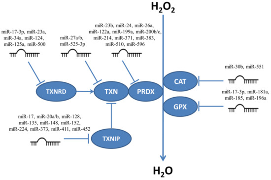 MiRNAs targeting enzymes responsible for neutralizing H2O2. CAT, catalase; GPX, glutathione peroxidase; PRDX, peroxiredoxin; TXN, thioredoxin; TXNRD, thioredoxin reductase; TXNIP, thioredoxin interacting protein.