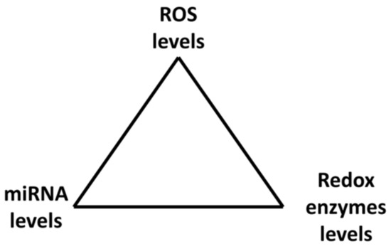 MiRNAs can be either down- or up-regulated after exposure to H2O2 depending on the H2O2 concentration. Therefore, miRNA levels depend on ROS concentrations in cells. ROS and miRNAs therefore create a kind of vicious circle or better a triangle where miRNAs affect ROS levels through ROS/RNS enzymes while ROS (H2O2) affect miRNAs levels; they are strictly connected and mutually influence each other. Together they create a system of feedback loops which may administrate cell responses to environmental conditions (Figure 4).