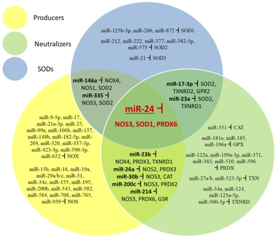 MiR-17-3p can target SOD2, TXNRD2 and GPX2 and miR-23a SOD2 and TXNRD1 transcripts affecting elements of conversion and neutralization of H2O2. MiR-23b can target NOX4, TXNRD1 and PRDX3; miR-26a NOS2 and PRDX3; miR-30b NOS3 and CAT; miR-200c NOS3 and PRDX2; miR-214 NOS3, PRDX6 and GSR transcripts affecting producing and neutralizing steps of the redox system. MiR-146a targets NOX4, NOS1 and SOD2 and miR-335 targets NOS3 and SOD2 transcripts which affect superoxide production and conversion. One miRNA (miR-24) affects all three elements of the ROS/RNS system, NOS3, SOD1, and PRDX6 transcripts.