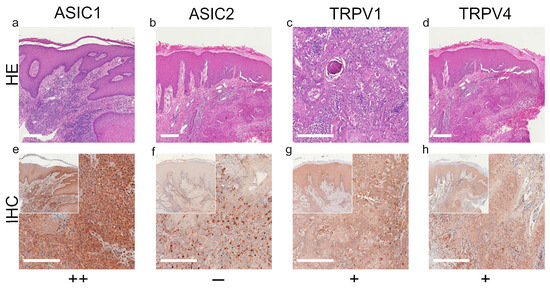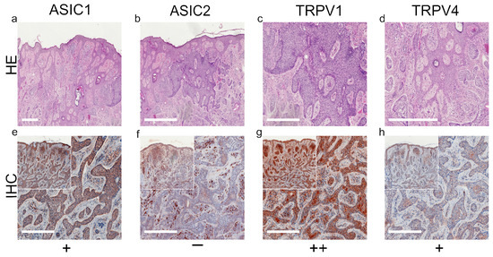 Immunohistochemistry of SCC. Immunohistochemical staining for ASIC1, ASIC2, TRPV1 and TRPV4 in SCC tissue. (a–d) H&E staining, (e–h) immunohistochemical staining, inserted smaller pictures represent a two times larger perspective. Scale bars represent 200 μm. (a–h) Patient 8. This SCC shows no expression of ASIC2, only some peritumoral lymphocytes appear positive. The tumor cells show a weak, positive expression of TRPV1 and TRPV4. ASIC1 is expressed strongly on tumor cells. For more stainings of other SCCs, see Supplementary Figures S1–S3.