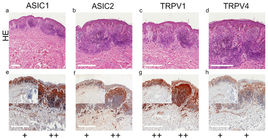 Immunohistochemistry of NCN. (a–d) H&E staining, (e–h) immunohistochemical staining, inserted smaller pictures show an overview. Scale bars represent 200 μm. (a–h) Patient 14. This NCN shows weak, positive expressions of ASIC1, ASIC2 and TRPV4 on the epidermal sections. TRPV1 is expressed strongly in the epidermis. Regarding the dermal area, ASIC1, ASIC2 and TRPV1 show strong expressions, whereas TRPV4 reveals a weak staining. It has to be mentioned that this NCN shows a decreasing expression in deeper dermal tumor tissue for all channels. For more stainings of other NCN, see Supplementary Figures S8–S11.