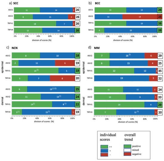 TRPV1. In SCC, the majority showed a strong positive expression (69%), 27% exhibited a weak expression and only 4% were negative (Figure 1c,g and Figure 5a, Supplementary Figures S1–S3 third column, Figure S16). In BCC, half of our samples were strong positive, the other half appeared weak positive (Figure 2c,g and Figure 5b, Supplementary Figures S4–S7 third column, Figure S16). The vast majority of the epidermal as well as the dermal parts of NCN appeared strong positive (epidermal: 73.6%, dermal: 63.6%), the rest was weak positive (epidermal: 26.4%, dermal: 36.4%) (Figure 3c,g and Figure 5c, Supplementary Figures S8–S11 third column, Figure S16). In MM, we also observed strong positive expression in the epidermis in 62.9% and in the dermis in even 79% (Figure 4c,g and Figure 5d, Supplementary Figures S12–S15 third column, Figure S16).