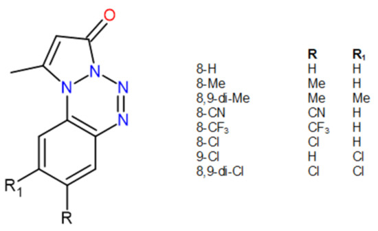 - Almerico, A.M.; Mingoia, F.; Diana, P.; Barraja, P.; Lauria, A.; Montalbano, A.; Cirrincione, G.; Dattolo, G. 1-Methyl-3H-pyrazolo[1,2-a]benzo[1,2,3,4]tetrazin-3-ones. Design, Synthesis, and Biological Activity of New Antitumor Agents. J. Med. Chem. 2005, 48, 2859–2866. [Google Scholar] [CrossRef]