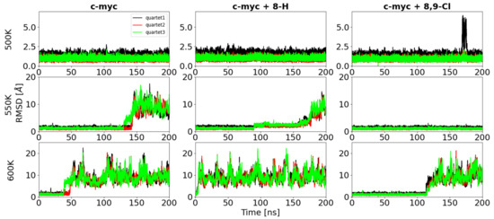 - Havrila, M.; Stadlbauer, P.; Islam, B.; Otyepka, M.; Sponer, J. Effect of Monovalent Ion Parameters on Molecular Dynamics Simulations of G-Quadruplexes. J. Chem. Theory Comput. 2017, 13, 3911–3926. [Google Scholar] [CrossRef]