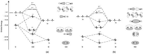 Quantitative energy level and molecular orbital diagram of CO (a) and NO (b) with electronic occupancy in the ground state. The asterisk identifies anti-bonding orbitals. Schematic shape of the bonding and frontier molecular orbitals of CO and NO. Black and white colors represent the phases of the orbital lobes.
