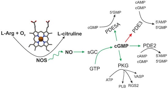 Schematic illustration of endogenous NO synthesis by NOS [45]. and subsequent cyclic guanosine monophosphate (cGMP) signaling cascade reaction [46]. Upon nitric oxide synthase (NOS) activation soluble guanylate cyclase (sGC) from guanosine triphosphate (GTP) cGMP is produced. cGMP can then activate cGMP-dependent protein kinase (PKG) and either activate (green line) or inhibit (red line) various phosphodiesterase (PDE) isoforms. PKG phosphorylates several protein targets, including phospholamban (PLB), vasodilatory-stimulated phosphoprotein (VASP), regulator of G protein signaling 2 (RGS2). PDE2 and PDE3 catabolize both cyclic adenosine monophosphate (cAMP) and cGMP, whereas PDE5 specifically catabolizes cGMP. Upon cGMP binding to its regulatory GAF domain, PDE2 undergoes a conformational change and increases its enzymatic activity for cAMP. PDE5 similarly increases its catalytic activity for cGMP by an order of magnitude upon cGMP binding to its regulatory small-molecule-binding domains i.e., GAF domain (found in cGMP, cAMP, FhlA) [47,48].